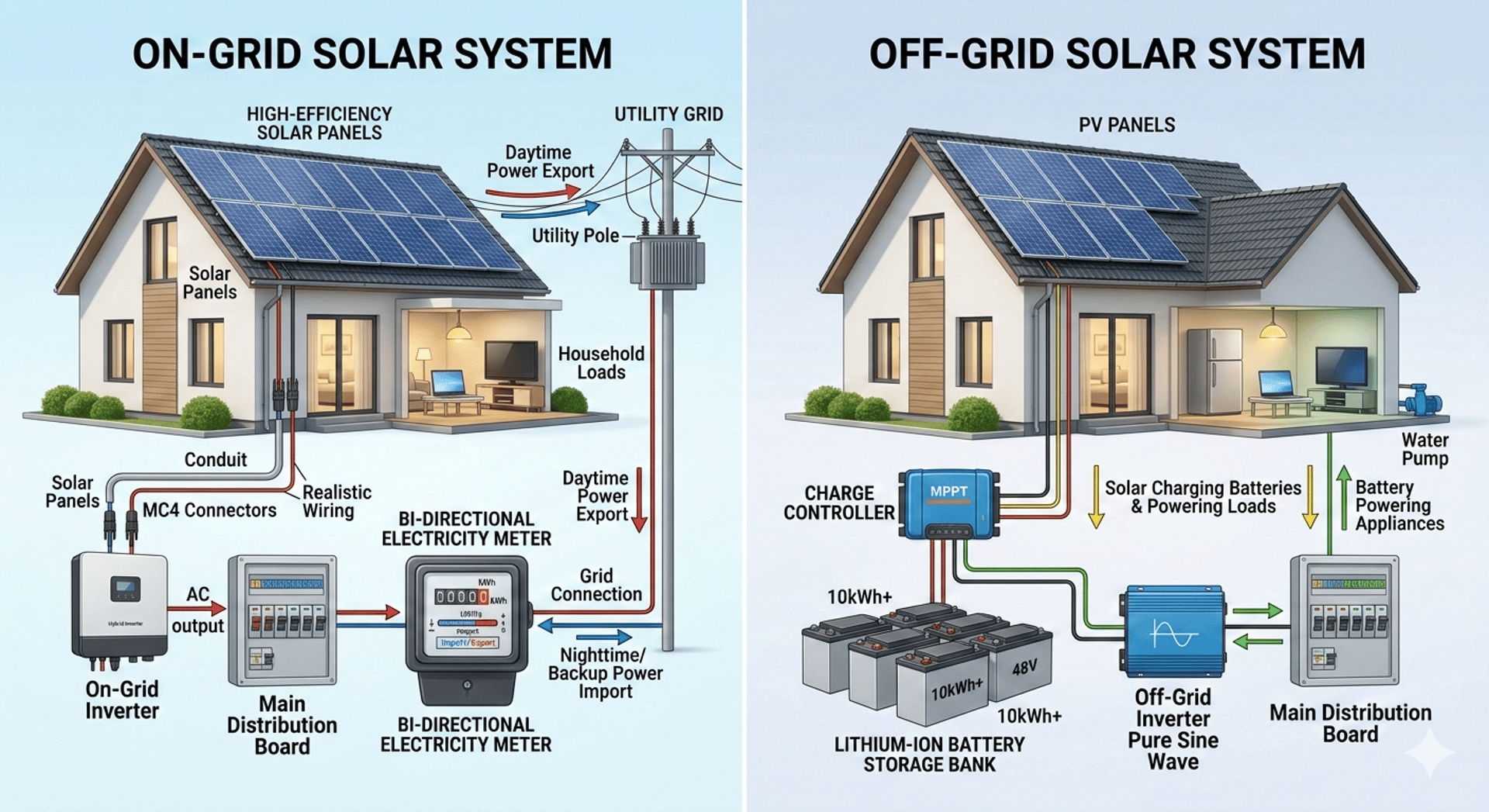 An Off-Grid Solar System operates independently without any connection to the national grid. It stores electricity in batteries for use during nighttime or load shedding.